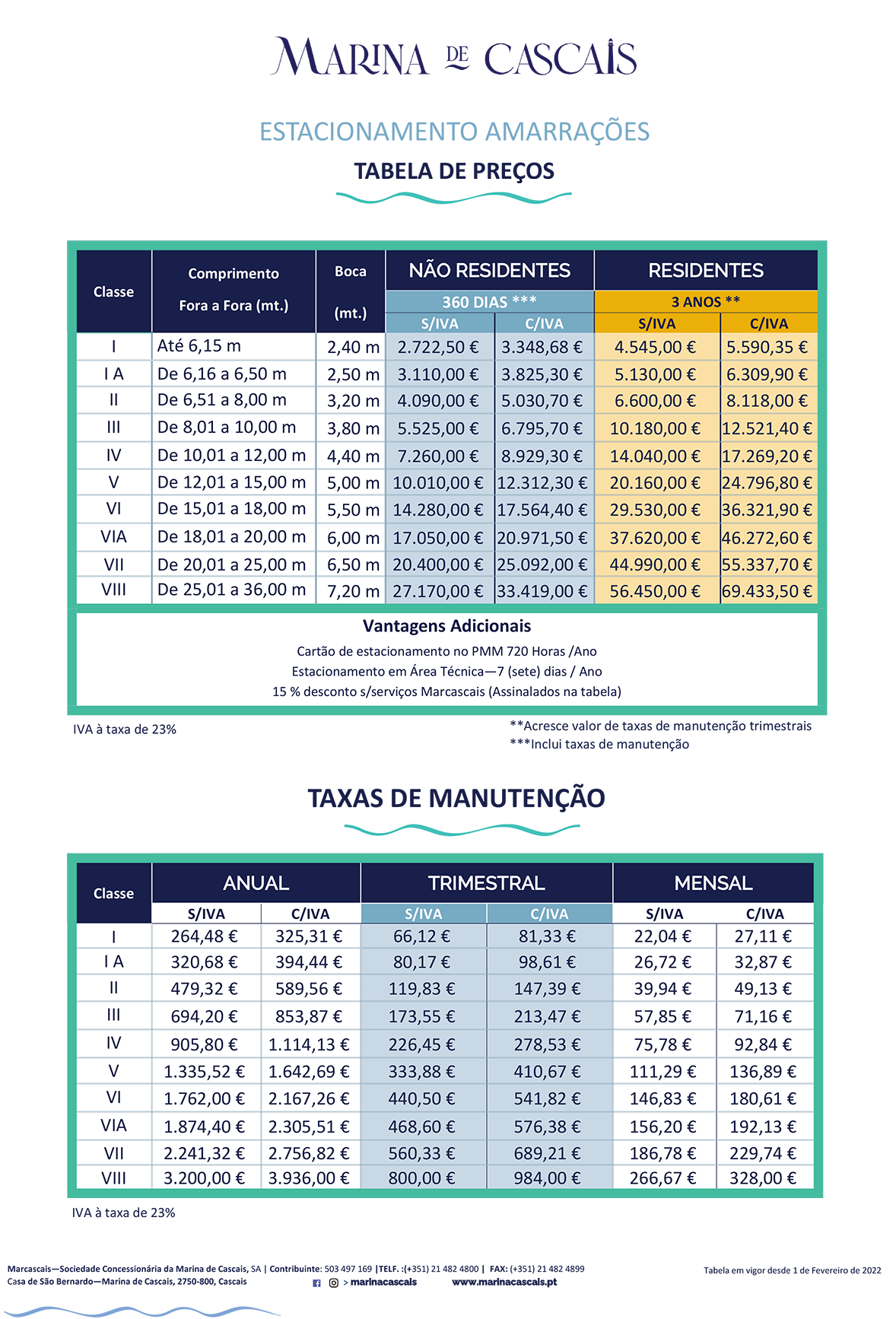 Nota: para estadias superiores a 365 dias, deverá entrar em contacto através do nosso formulário (com ligação) ou através do email apoio@marinacascais.pt.