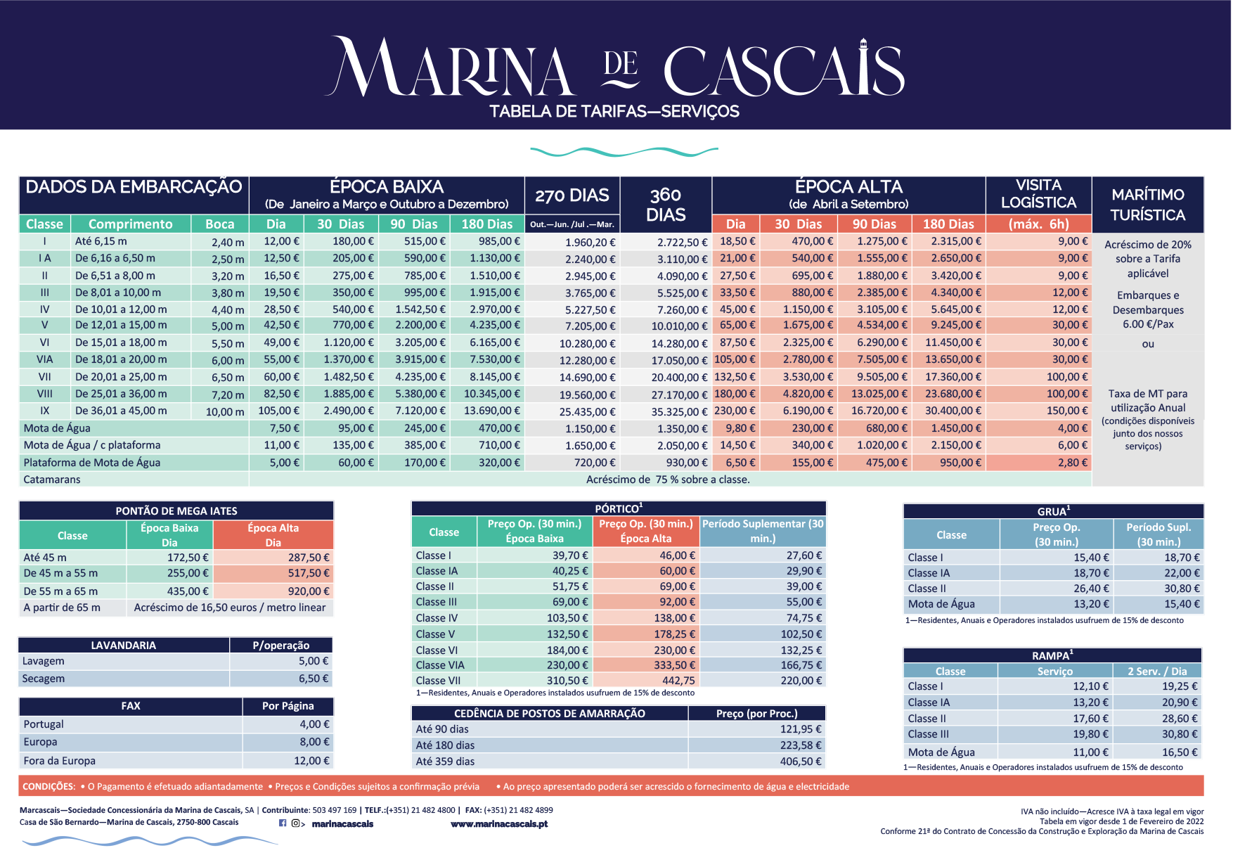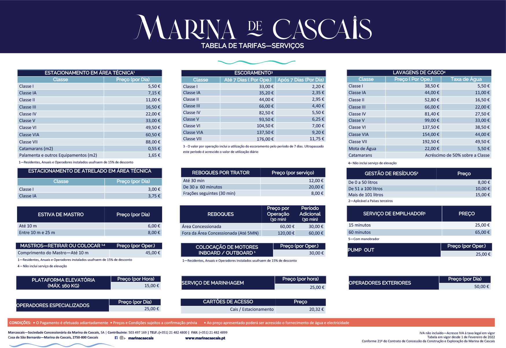 Estadias e serviços – o tarifário na Marina de Cascais é estabelecido pelo comprimento da embarcação e tamanho de boca.